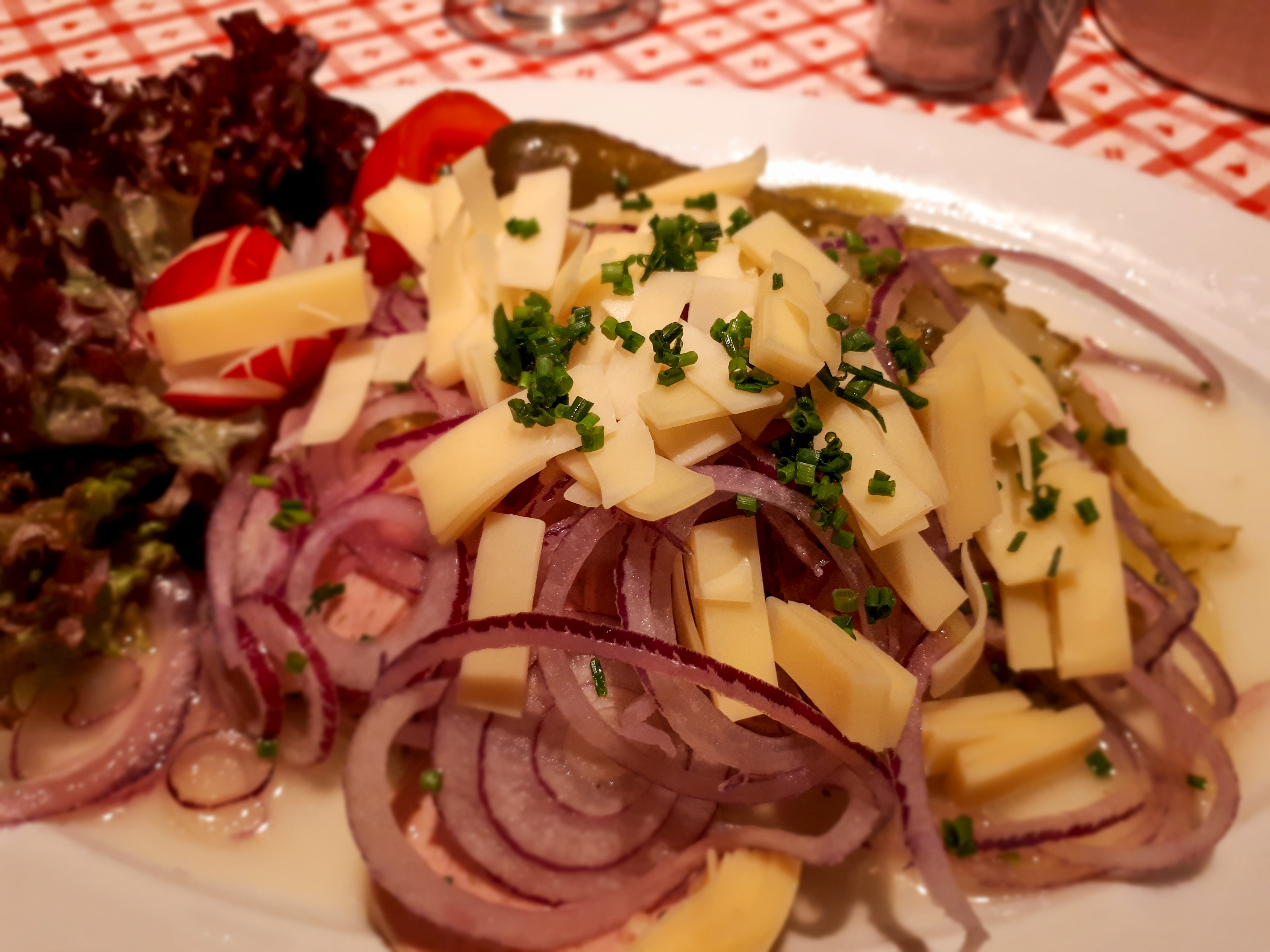 얇게 썬 소시지 산 위에 양파, 피클, 치즈가 얹힌 새콤한 요리였다.